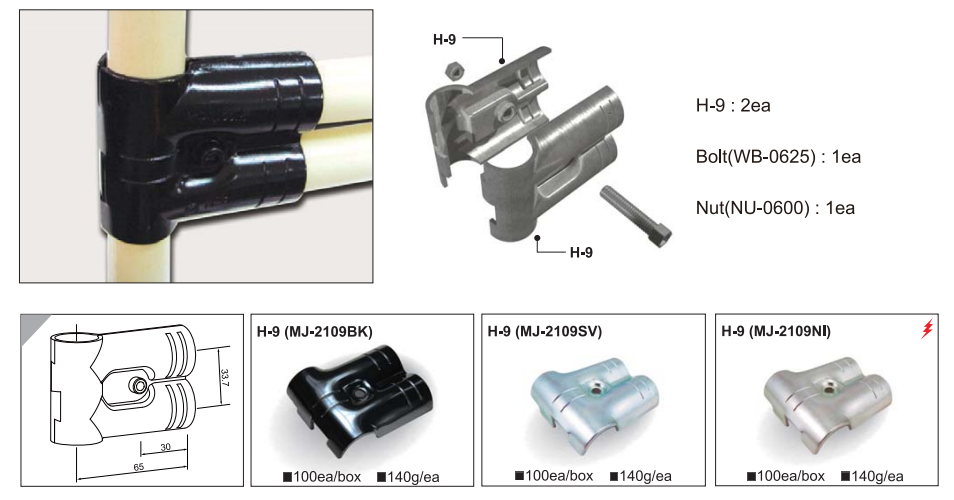 Bộ khớp nối HJ-9 được sử dụng rộng rãi trong đời sống. Áp dụng để liên kết các ống inox, ống thép theo nhiều cách phục vụ mục đích tạo thành những mô hình thực tiễn cho con người như: bàn thao tác, xe đẩy, kệ đựng hàng hóa,…..
