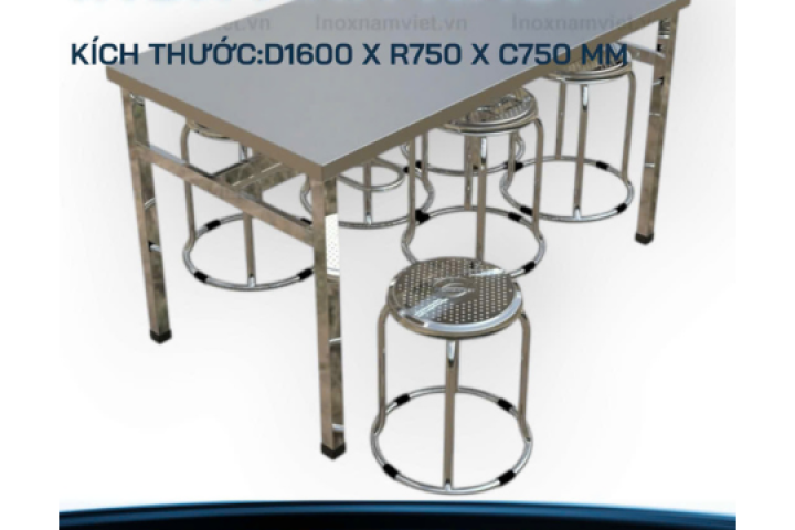 Kích thước tiêu chuẩn: Bàn thường có kích thước khoảng 1600x750x750 mm (dài x rộng x cao), ghế đôn cao khoảng 500mm, phù hợp với đa số người sử dụng.