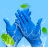 Găng tay y tế màu xanh làm bằng cao su nhân tạo Nitrile, bền, co giãn tốt.