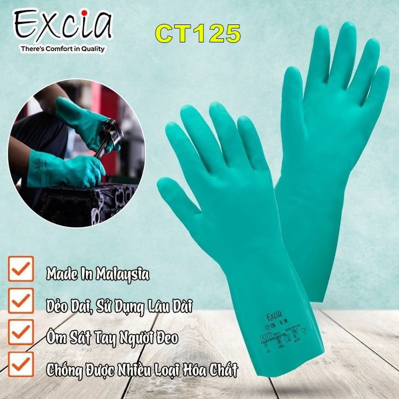 Găng tay cao su chống hóa chất Excia CT125 ( CT135 ) được làm từ cao su tổng hợp Nitrile giúp bảo vệ đôi tay trong các môi trường có dung môi, hoá chất, acid loãng, dầu mỡ…
