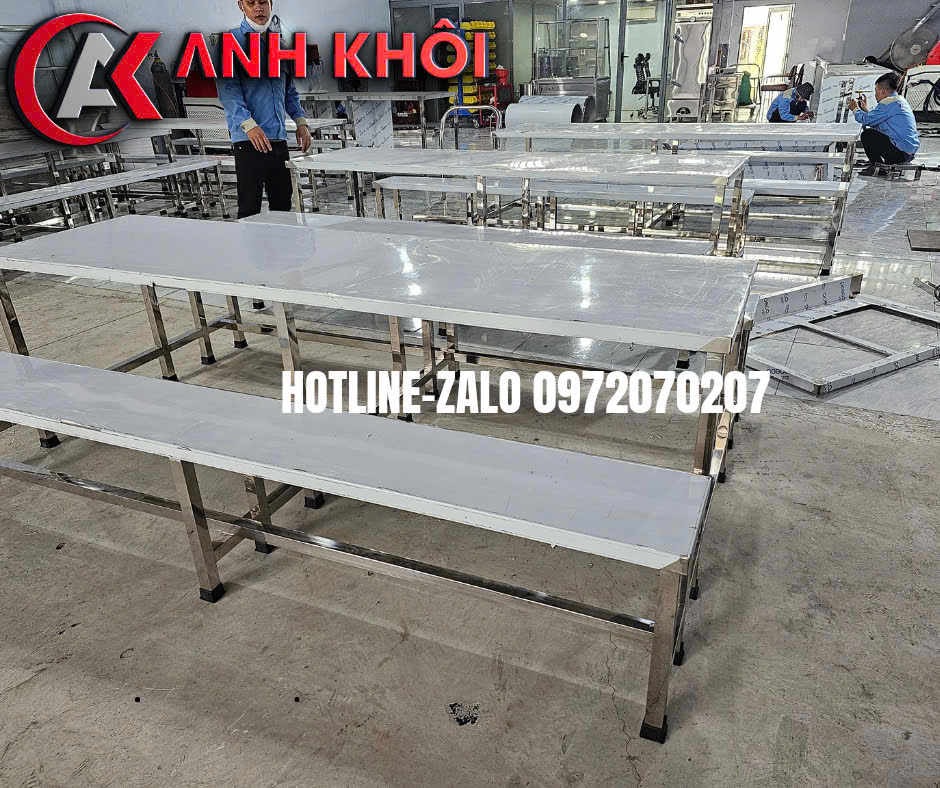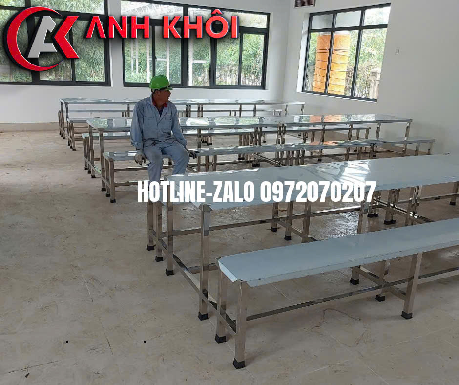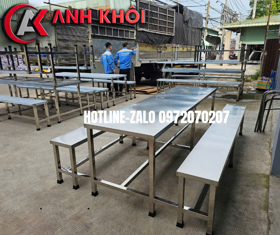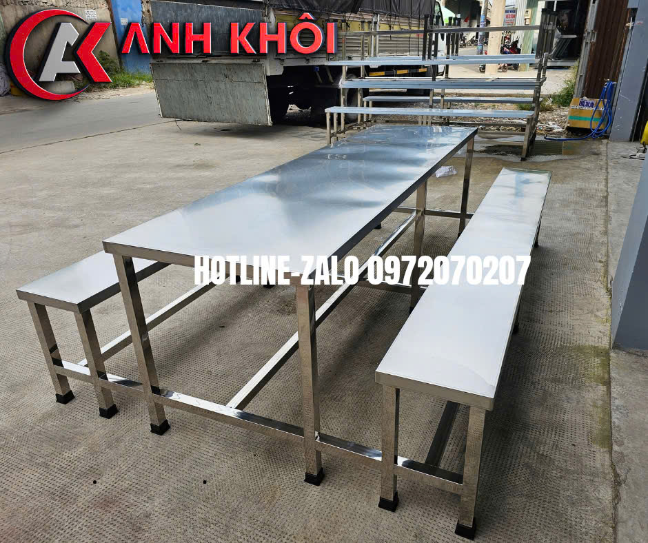 INOX ANH KHÔI chuyên gia công, sản xuất bàn ăn inox liền ghế theo yêu cầu kích thước, số lượng với giá cạnh tranh. Cam kết inox chuẩn, độ dày tiêu chuẩn, hàn chắc chắn, giao hàng đúng tiến độ.