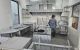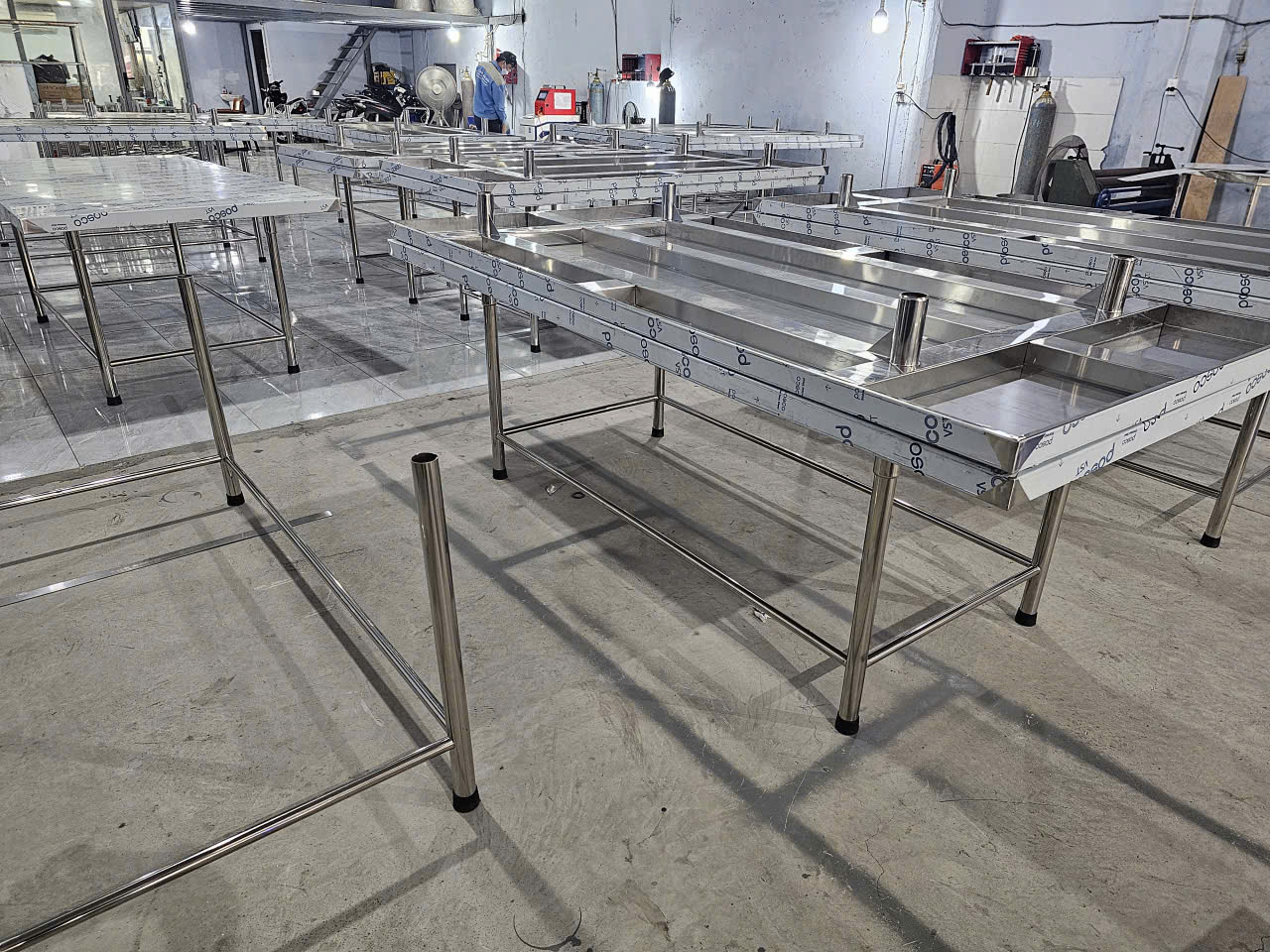 Bàn làm việc trong bếp công nghiệp, nhà máy, khu chế biến, siêu thị.