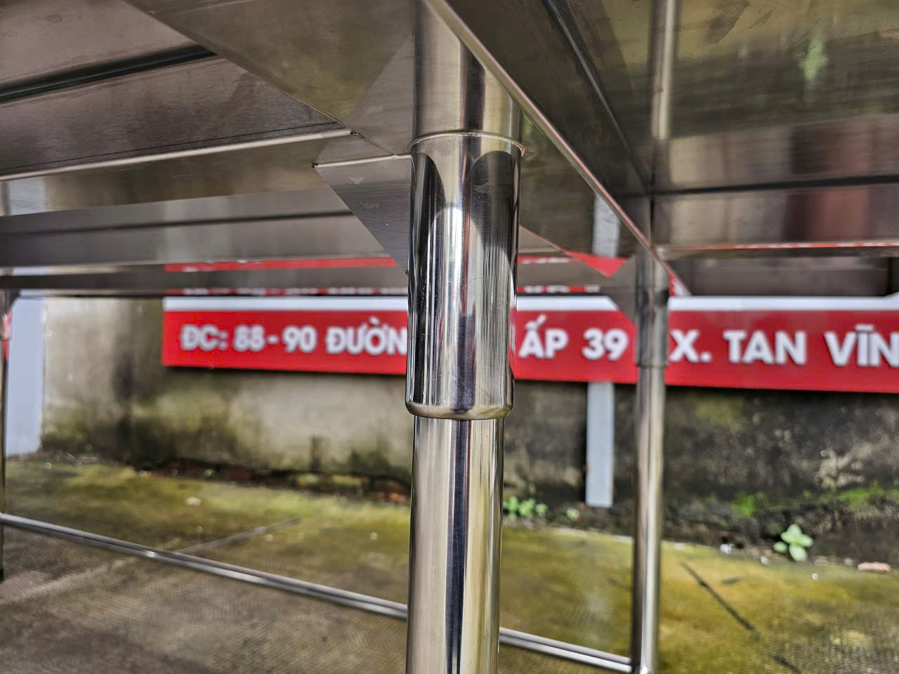 Mặt bàn: Gia công phẳng, bo tròn cạnh an toàn, đảm bảo vệ sinh thực phẩm.
