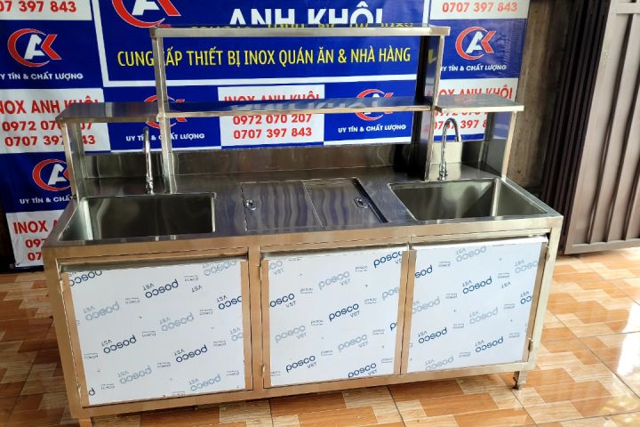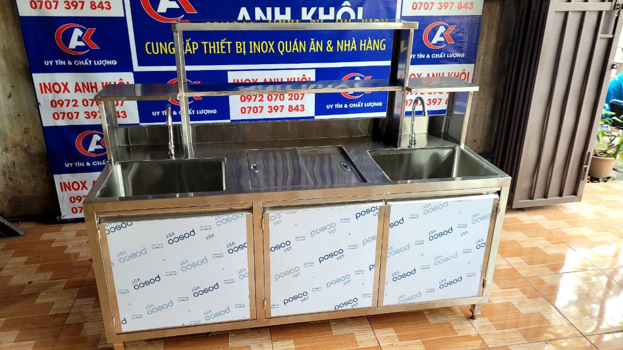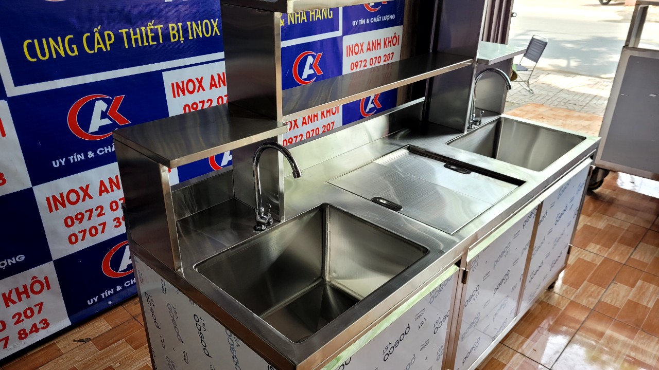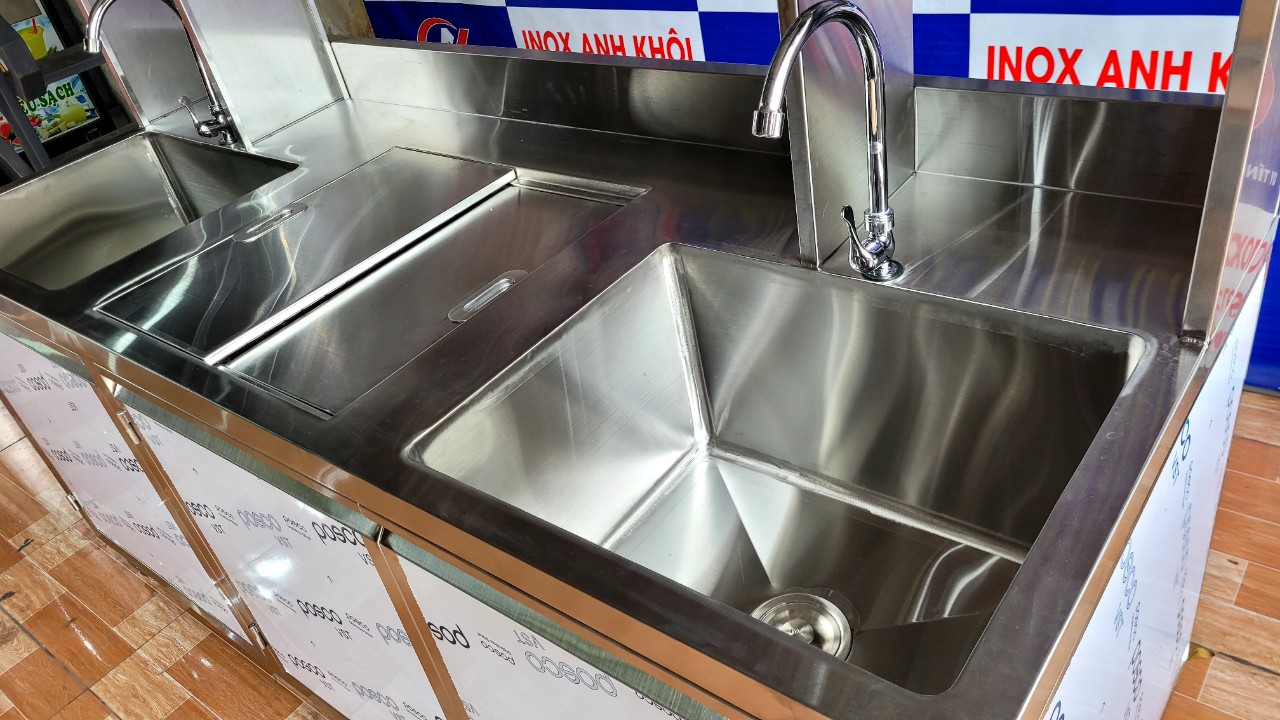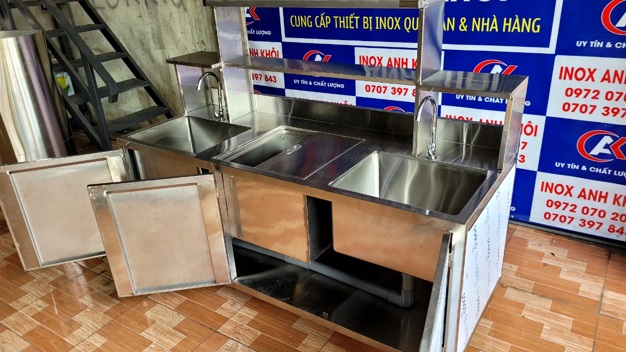 • SẢN XUẤT INOX ANH KHÔI – KÍCH THƯỚC : D1800 x R700 x C800/1400 – CHẤT LIỆU : INOX 304 – 2 CHẬU RỬA – 1 THÙNG ĐÁ