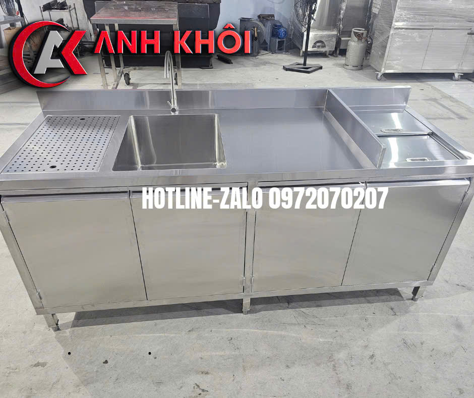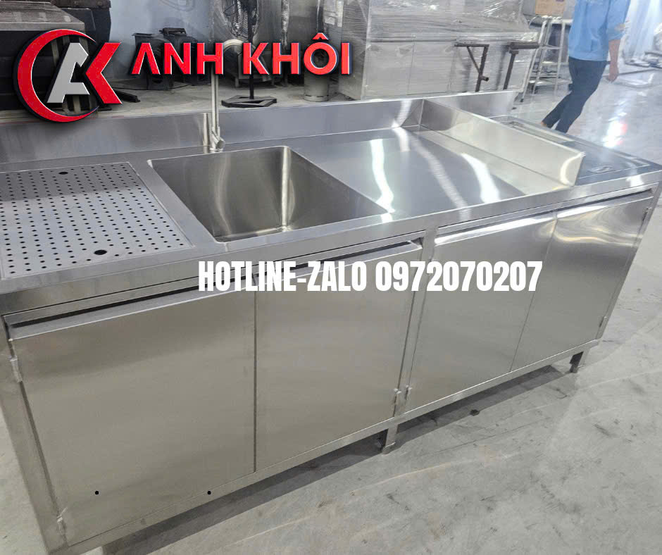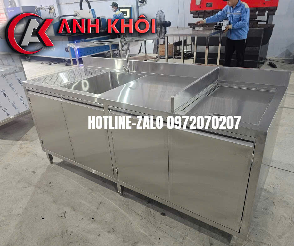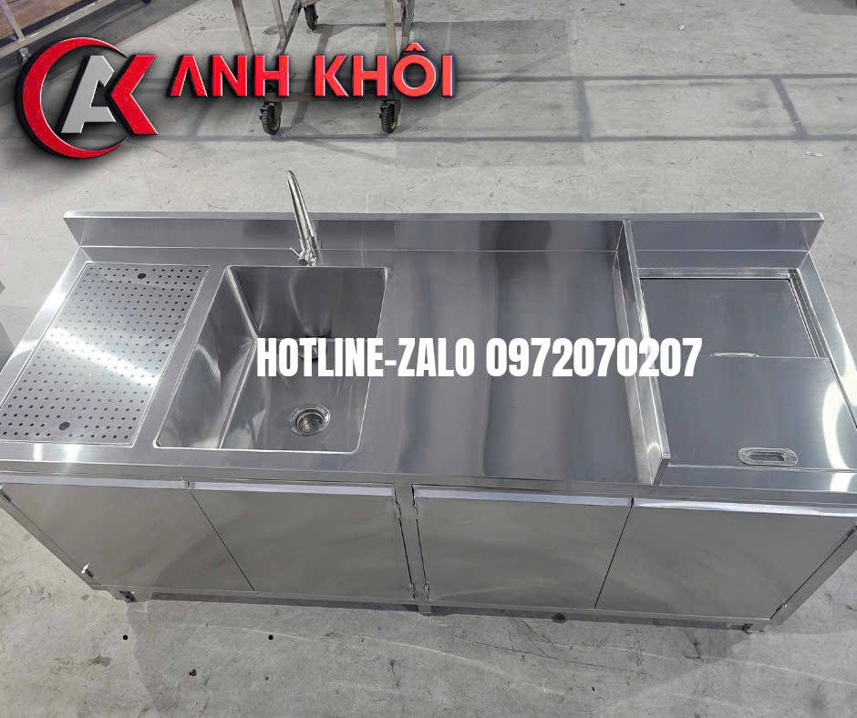 Chậu rửa inox: Lắp kèm vòi nước, bồn rửa sâu, thoát nước nhanh, thuận tiện vệ sinh dụng cụ.