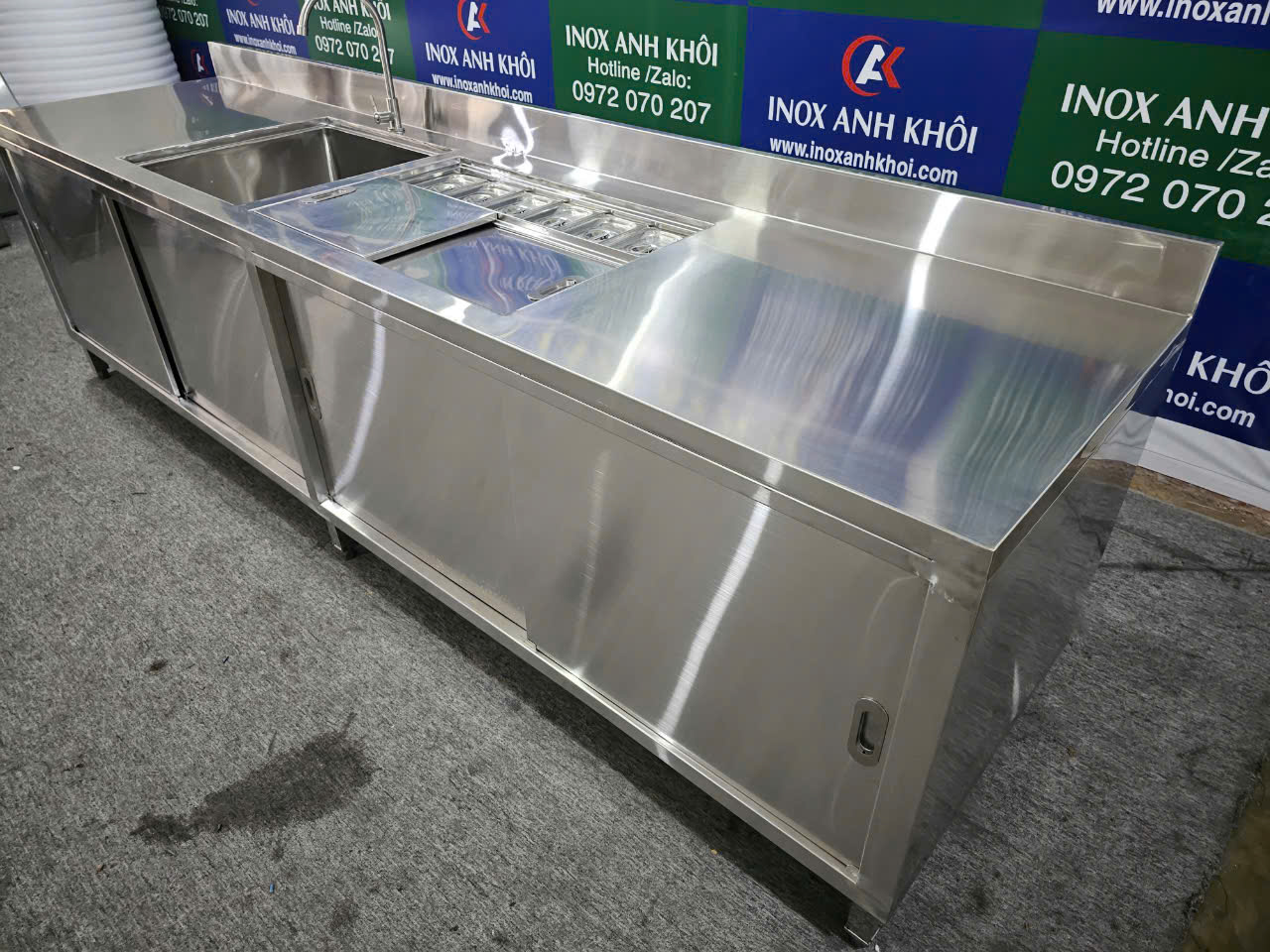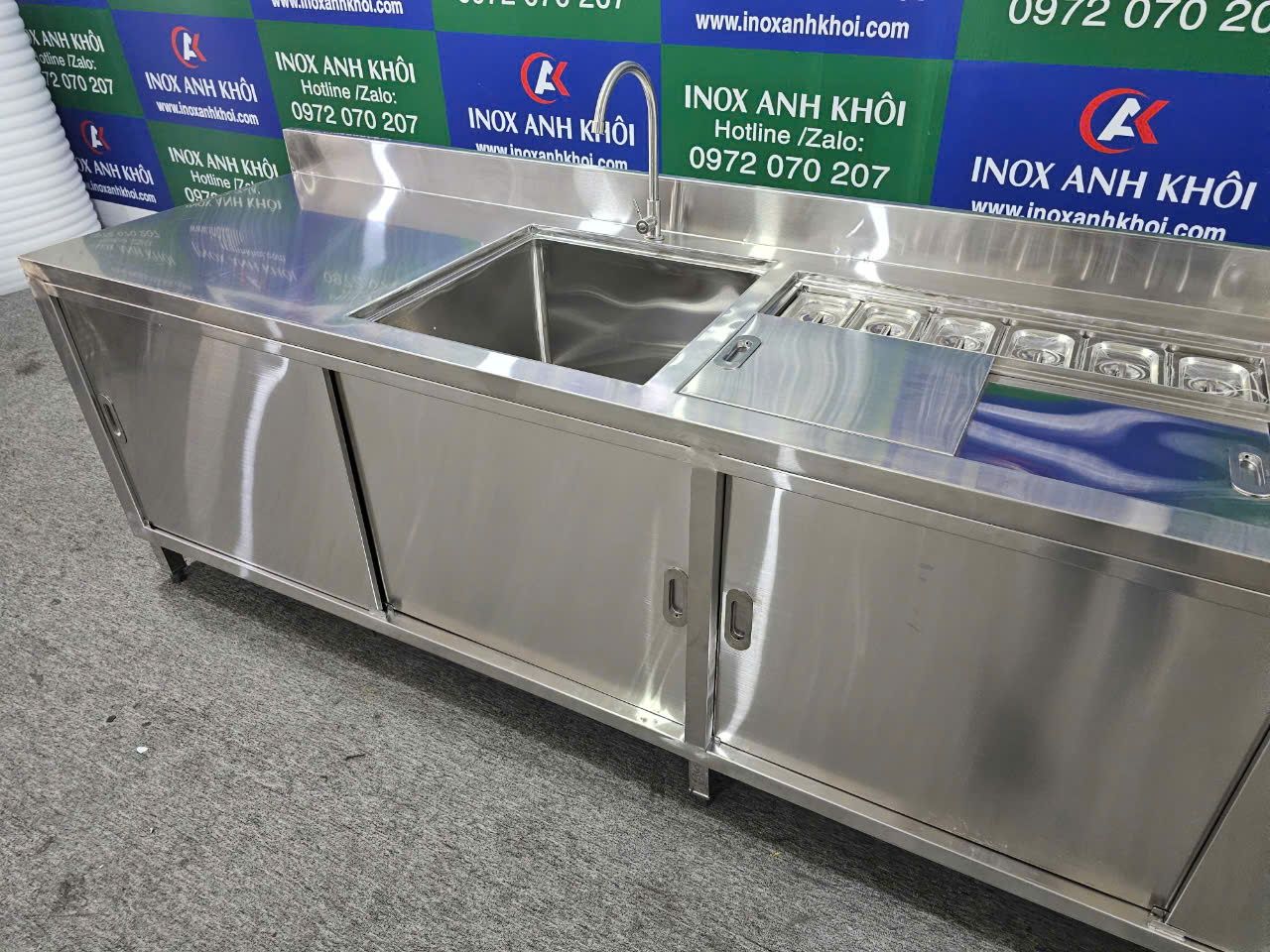 Nếu bạn đang tìm kiếm một quầy inox chất lượng cao với đầy đủ tính năng, quầy inox dài 2m80 có chậu rửa, thùng đá và khay topping chắc chắn sẽ là một lựa chọn tối ưu cho không gian làm việc chuyên nghiệp và sạch sẽ.