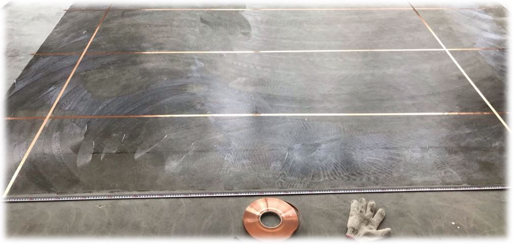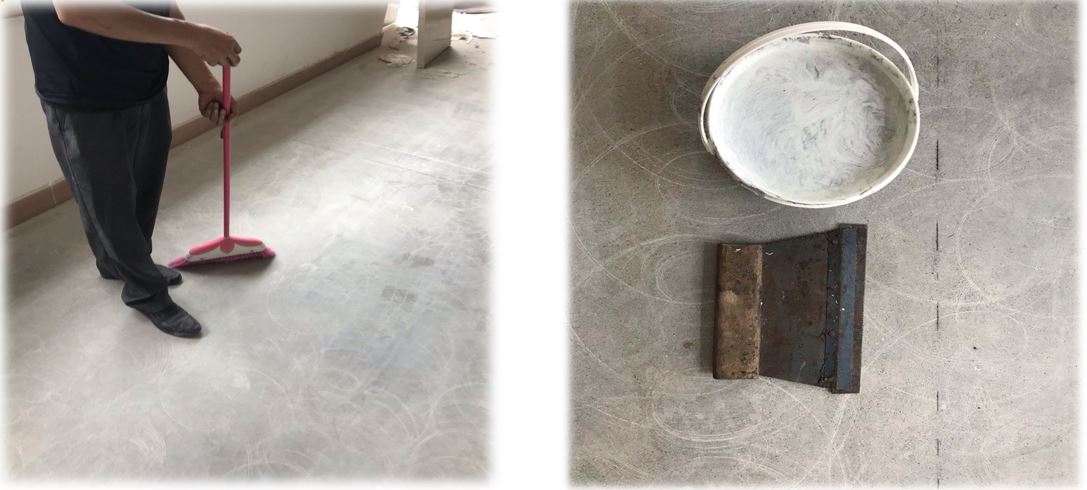 Bước 2: Sau khi đánh bóng sàn, tiến hành lau sạch sàn. Sau đó, chuẩn bị keo dán dẫn điện chuyên dụng và dụng cụ cạo tiêu chuẩn.