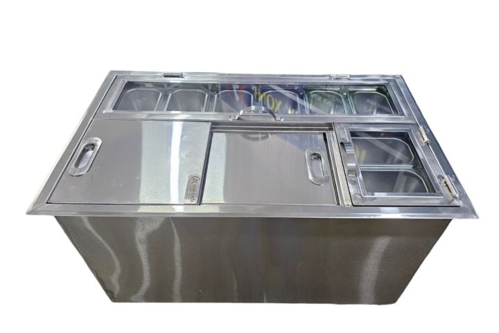 .Thùng đá có thiết kế nắp trượt hoặc nắp mở để thuận tiện cho việc sử dụng của từng loại hình sử dụng . hoặc phía trên hoặc bên cạnh của thùng đá inox quầy bar được thiết kế thêm khay topping trưng bày trái cây 1 cách đẹp mắt , để tạo ấn tượng đối với khách hàng . có thêm 1 ngăn đá riêng để bảo quản , ướp các nguyên liệu pha chế , hoặc bia rượu .