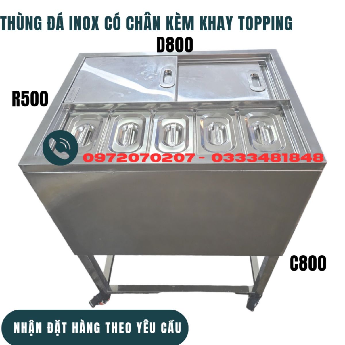 THÔNG SỐ KỸ THUẬT THÙNG ĐÁ INOX CÓ CHÂN KÈM KHAY TOPPING