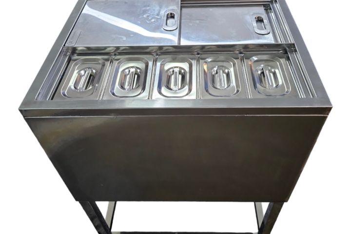 .Thùng đá có thiết kế nắp trượt hoặc nắp mở để thuận tiện cho việc sử dụng của từng loại hình sử dụng . hoặc phía trên hoặc bên cạnh của thùng đá inox quầy bar được thiết kế thêm khay topping trưng bày trái cây 1 cách đẹp mắt , để tạo ấn tượng đối với khách hàng . có thêm 1 ngăn đá riêng để bảo quản , ướp các nguyên liệu pha chế , hoặc bia rượu .